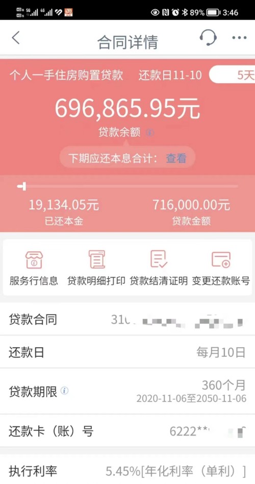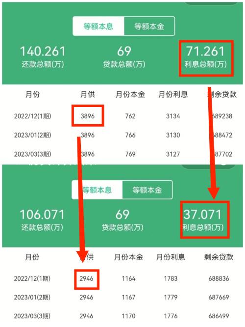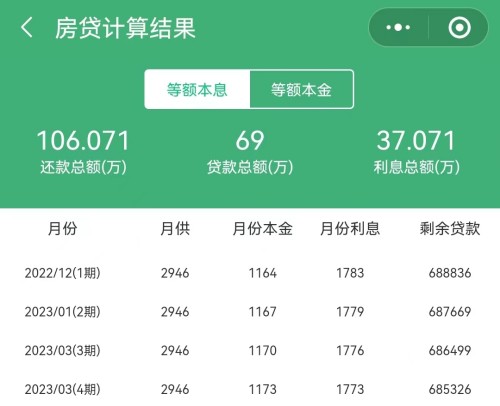 從上兩張圖可以看到,房貸本金69萬,一共需要還71.261萬利息;總共是140.261萬。